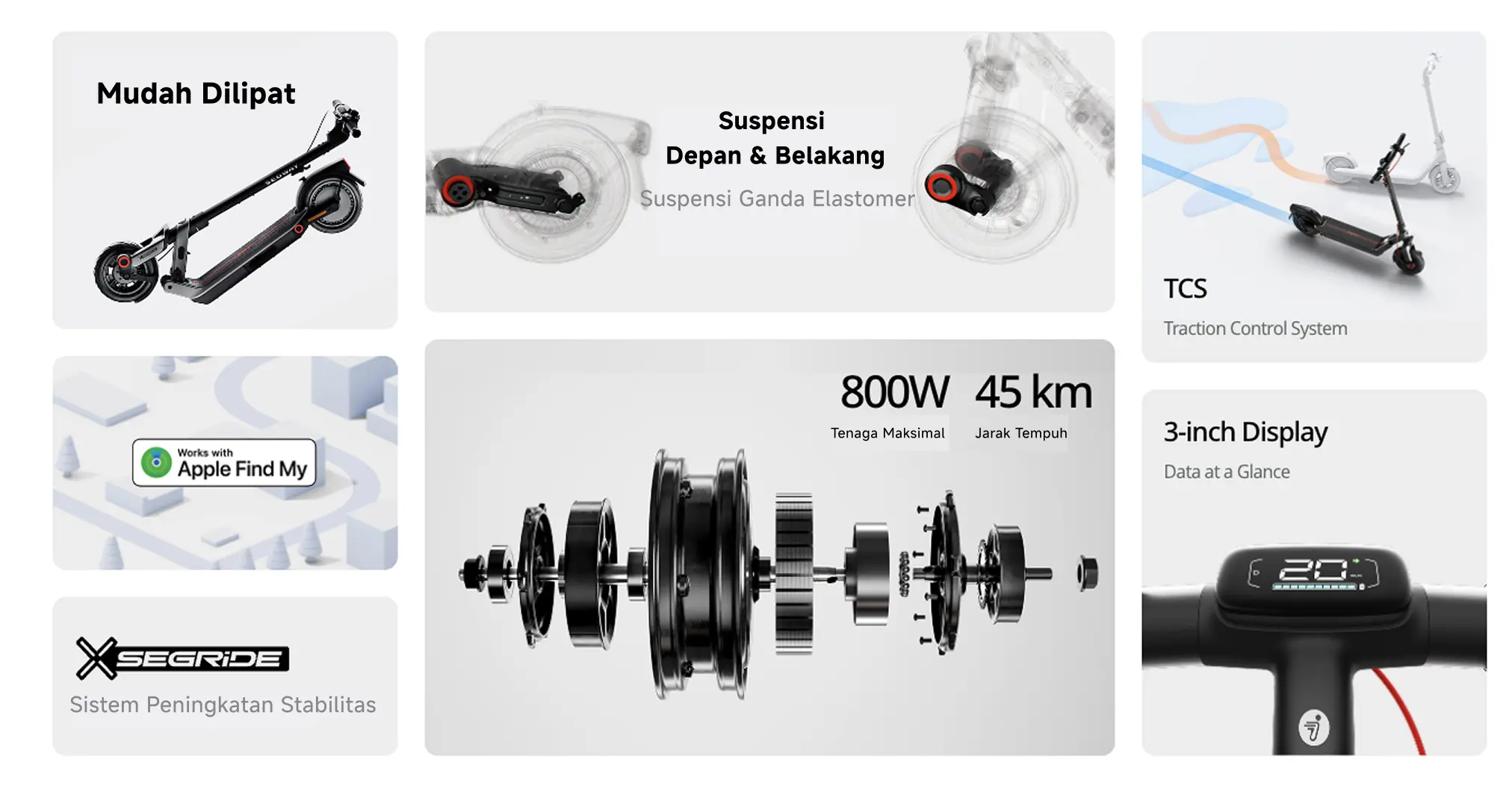[1] Jarak Tempuh (Mode Eco) Diuji dengan baterai penuh, beban 75 kg, suhu 25°C (77°F), dan kecepatan konstan 15 km/jam di permukaan jalan rata.